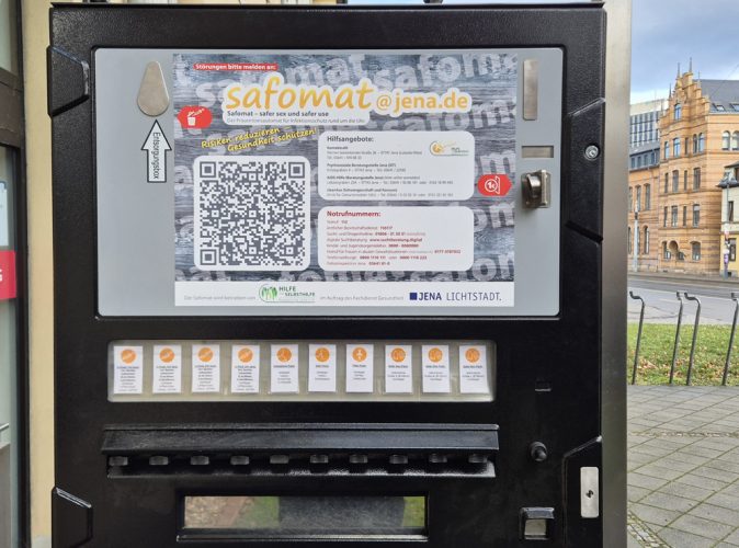 Der Safomat dient der Erweiterung des Angebotes im Bereich schadensminimierender Unterstützung und Infektionsprophylaxe und ermöglicht es, spezifische Informationen zielgerichtet zu transportieren und auf weiterführende Hilfen und Angebote (ggf. in unterschiedlichen Sprachen) aufmerksam machen.